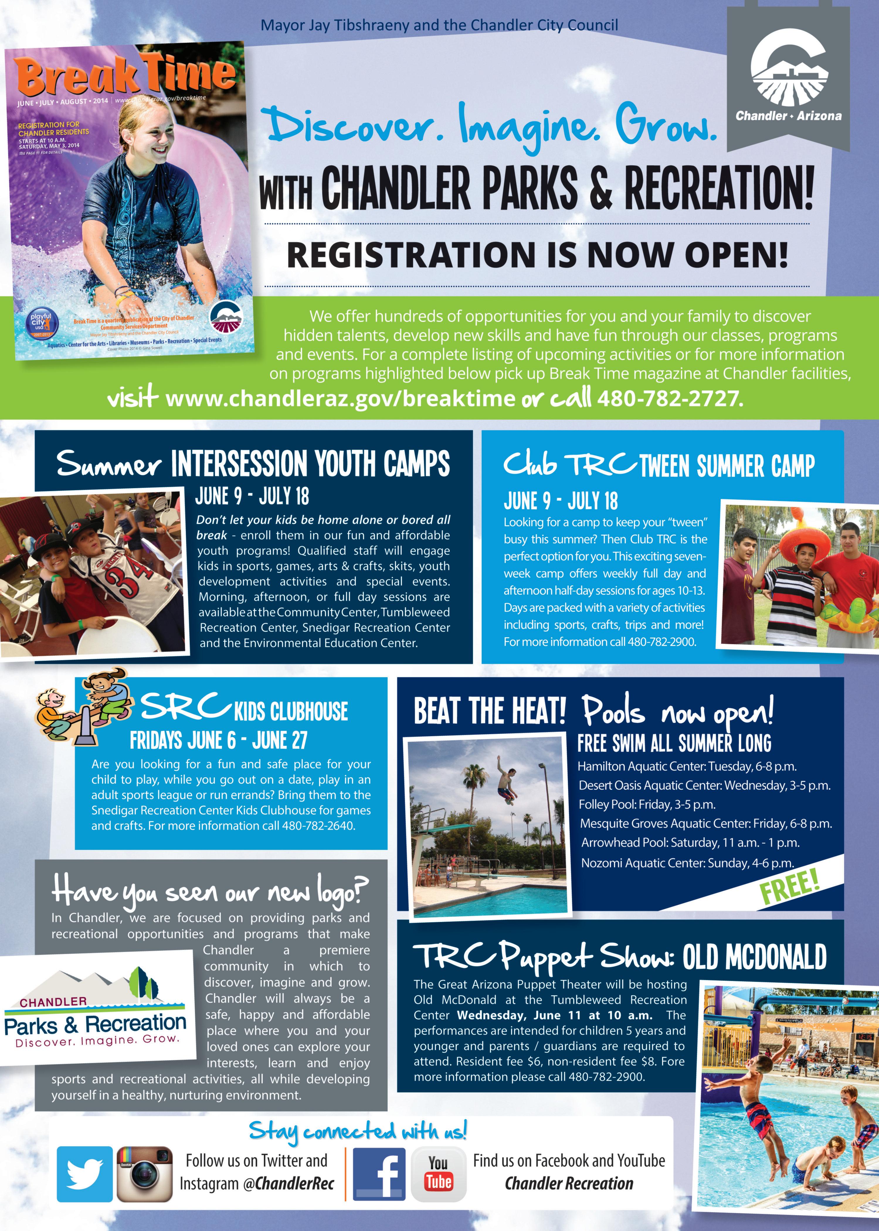 Family Night, 5:30 p.m.-7 p.m. On the first and third Wednesdays of the month, enjoy a variety of different recreational activities and entertainment. Tumbleweed Recreation Center, 745 E. Germann Rd., Chandler. Youth resident: $2, nonresident: $3; $3 teen resident, $5 teen nonresident. (480) 782-2908, www.chandler.gov/breaktime.