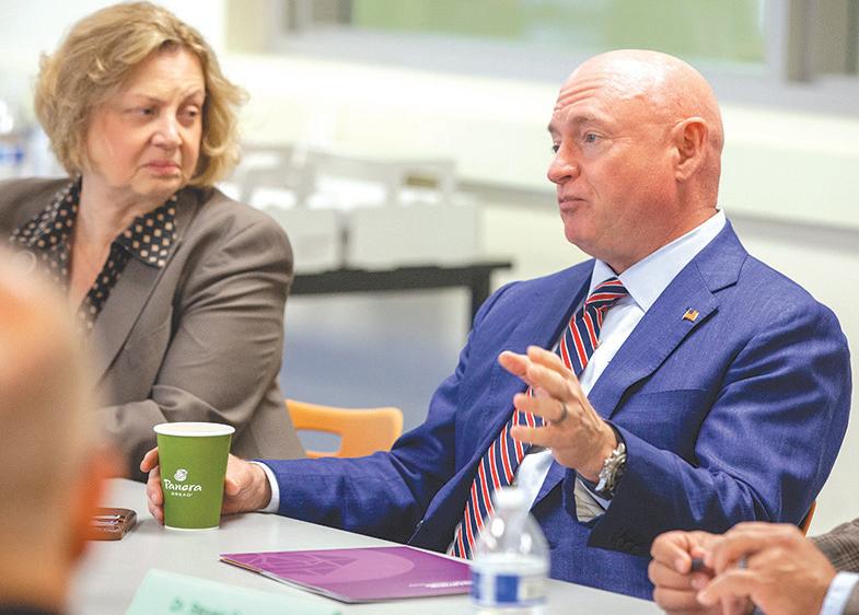 Sen. Mark Kelly and Susan Bitter Smith, a Maricopa Community Colleges Governing Board member and interim chancellor for Maricopa Community Colleges, are presented with Estrella Mountain Community College’s training program for hightech manufacturing. (Cassandra Tomei/ Contributor)