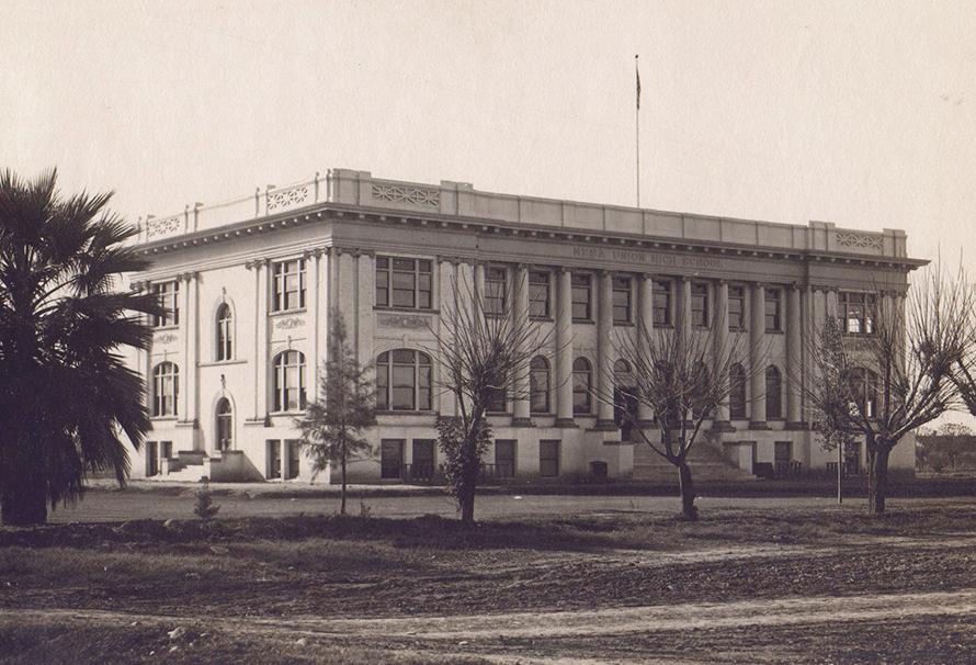 Mesa Union High School was built in 1908 at Center and Macdonald streets. It was Mesa’s only high school for nearly 60 years. e original building, which would become known as “Old Main,” had a main floor auditorium with a swimming pool in the basement. e auditorium was used for assemblies, with folding chairs for the early comers and standing room only for the rest. Ten years later, eight more rooms were added, plus a small auditoriumgymnasium. During basketball games, spectators sat in the balcony (above the freshman section) or on the stage because the gym was not wide enough for sideline bleachers.