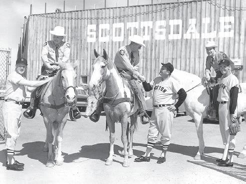 The arrival of Major League Baseball spring training in 1956 added another touch of glamour to Scottsdale. Spring training in Scottsdale Stadium brought many of the celebrities of baseball to local restaurants and resorts, as well as the baseball diamond. In this 1959 photo, Boston Red Sox players Ted Williams (right), Jackie Jensen (left), and manager Mike Higgins (center) greet the local sheriff and officers.