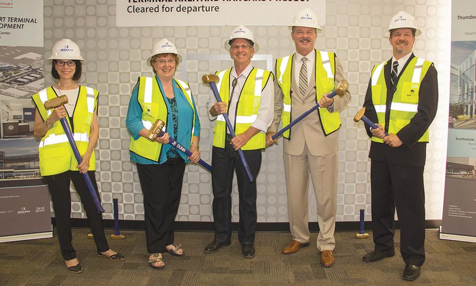 “ is project is clear for departure,” Scottsdale Mayor Jim Lane declared at the ceremonial groundbreaking held July 12 at the terminal, which instead of shovels, featured a “wall breaking” by sledgehammer-wielding City Council members and aviation director Gary P. Mascaro.