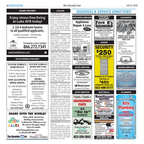 LOOKING for an affordable 62+ senior apartment? Superior Arboretum Apartments, immediate occupancy, one bedroom & studios, on-site laundry & utility allowance. Rent based on Income Guidelines. 199 W. Gray Dr., Superior, AZ. Call 1-866962-4804, www.ncr.org/superiorarboretum. Equal Housing Opportunity. Wheelchair Accessible. (AzCAN) TIMESHARE Cancellation Experts – Over $50,000,000 in timeshare debt and fees cancelled in 2019. Get free informational package and learn how to get rid of your timeshare! Free consultations. Over 450 positive reviews. Call 866482-0406 (AzCAN)