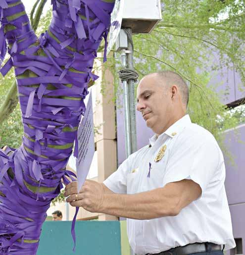 Chief Jeff Clark of the Chandler Fire, Health & Medical Department adds a purple ribbon to trees outside Phoenix Children’s Hospital as part of Drowning Impact Awareness Month kickoff event. STSN photo by Israel Gonzalez