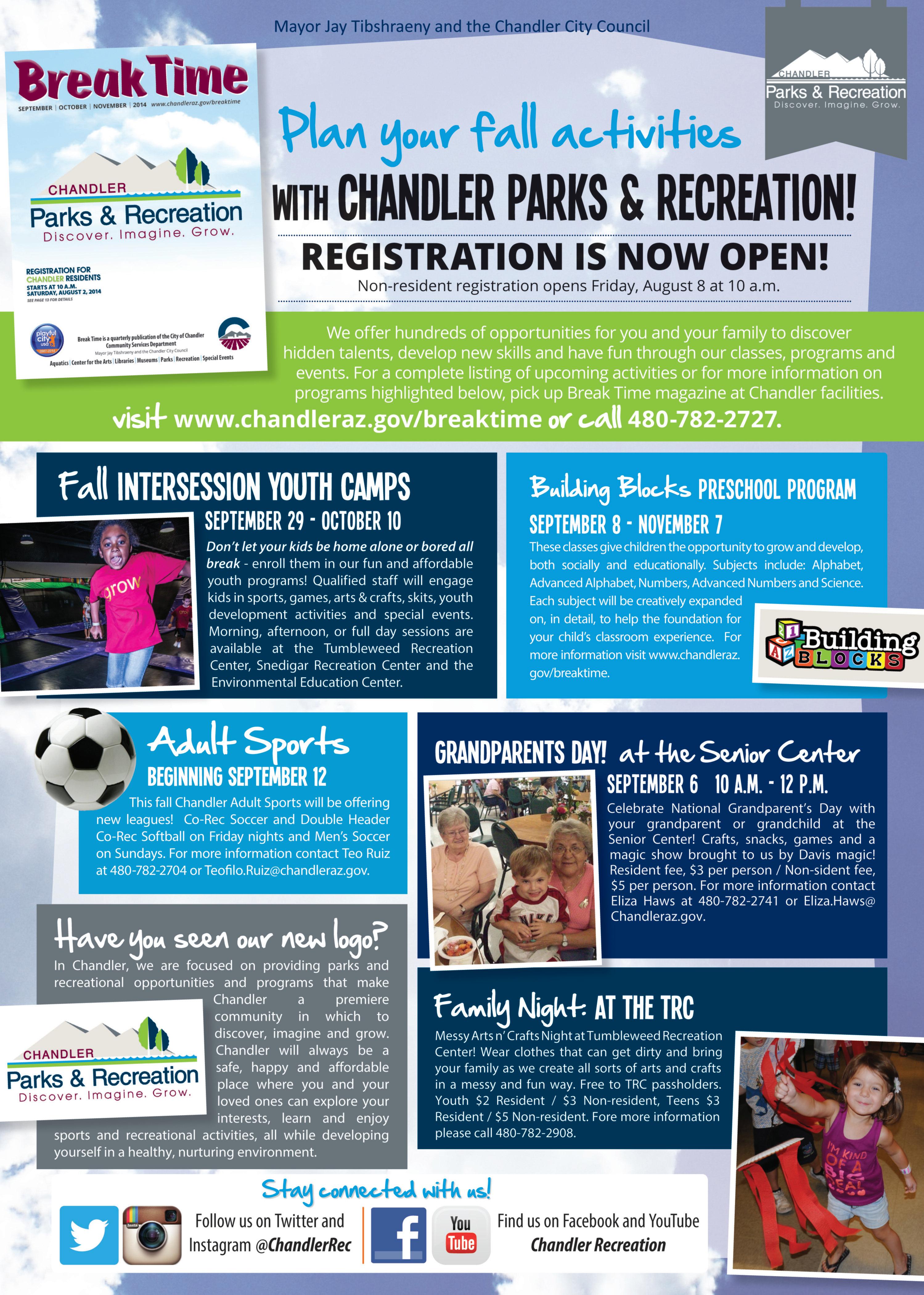 Family Night at the TRC, 5:30 p.m. to 7 p.m. The first and third Wednesdays of the month enjoy a variety of different recreational activities and entertainment. Tumbleweed Recreation Center, 745 E. Germann Rd., Chandler. Youth $2 resident; $3 nonresident; teens $3 resident; $5 nonresident. For more information contact Michael Fenzel, (480) 782-2908. www.chandleraz.gov/breaktime.