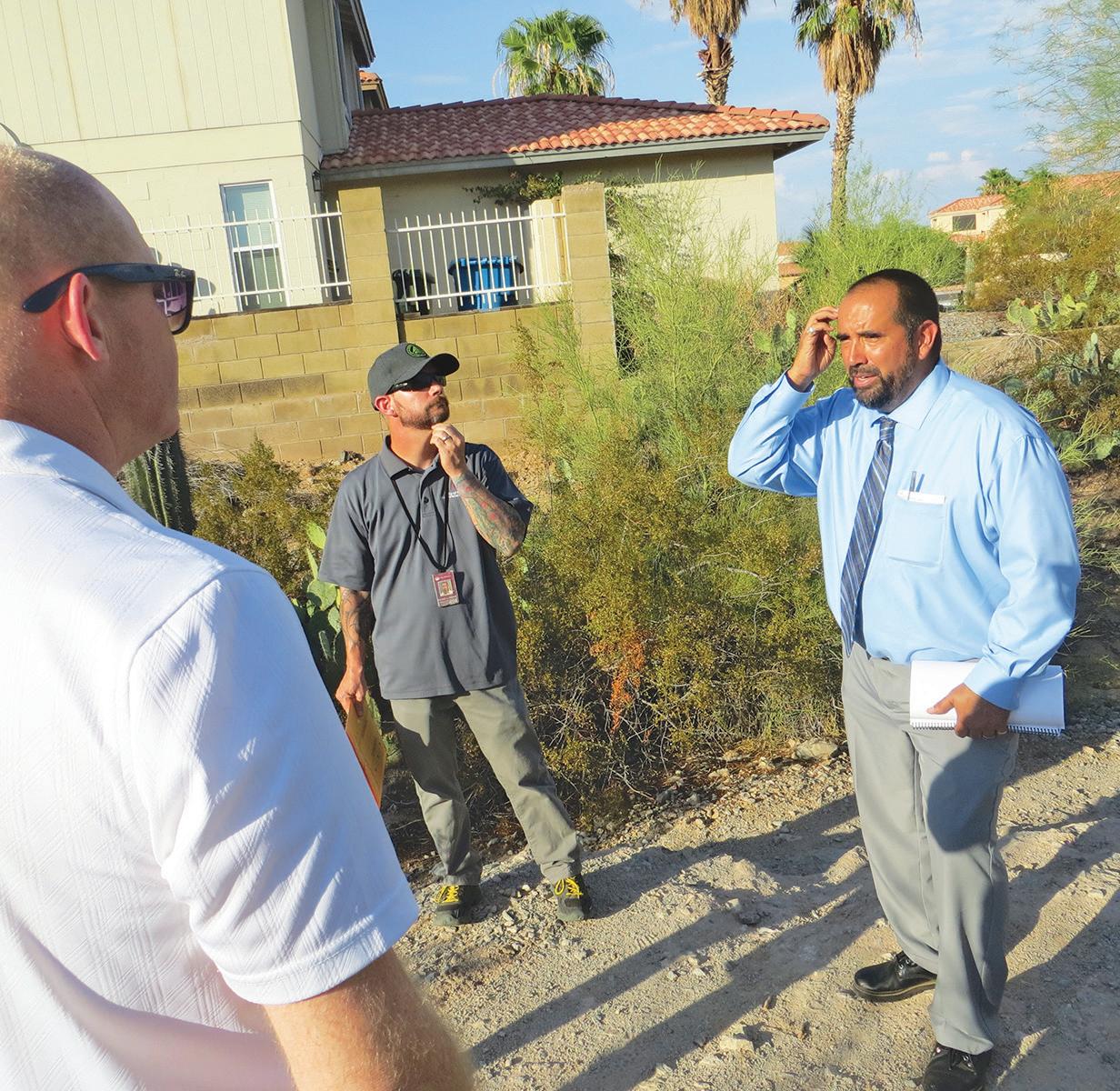 City parks landscape architect Aaron Jensen, right, talks with Ahwatukee resident David Drennon, left, and Mke Francis, park supervisor, about a sewer line that will be installed at the Pima Canton trail head.