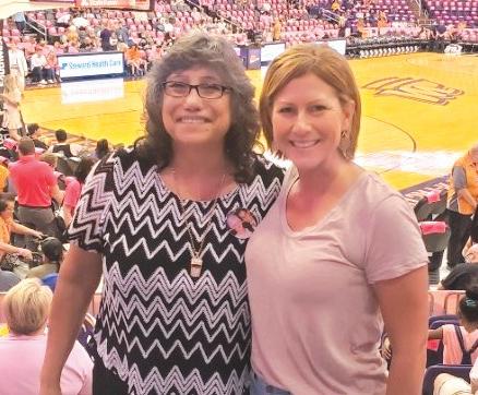 Apollo High School coach Sue Prado, left, was accompanied by Principal Brooke Parsons to be recognized by the Phoenix Mercury at a recent game. (Photo courtesy Glendale Union High School District)