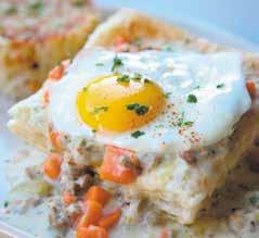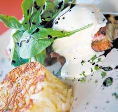brought our menus. He let us know that they are made from recycled paper and that sustainability, which includes composting and recycling, is important. Snooze also donates 1 percent of sales to the local community. The menu was delightful, placing the dishes into four categories—“flavors from the hen,” “the art of Hollandaise,” “like a feather” and “sweet utopia.” This menu oozed creativity and each offering sounded even better than the last.