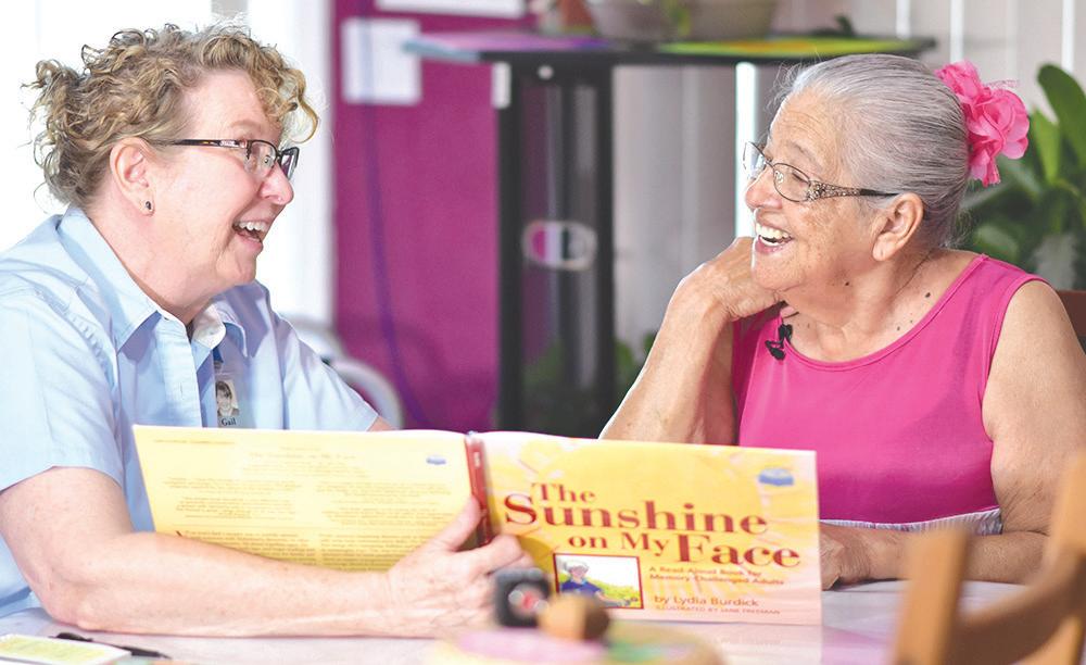 I spent two hours watching her engage 86-year-old Tomasa, who had retreated into quiet solitude over the last few years. But she perked right up when Gail brought out books and puzzles, and soon was turning pages and tting pieces of colored cardboard together. Gail presented a vase and owers, and immediately Tomasa was absorbed in creating a beautiful arrangement. Gail chatted about Tomasa’s nine children as she handed her a lifelike baby doll. Tomasa cradled and cooed. But the real transformation happened when Gail played Spanish folk music