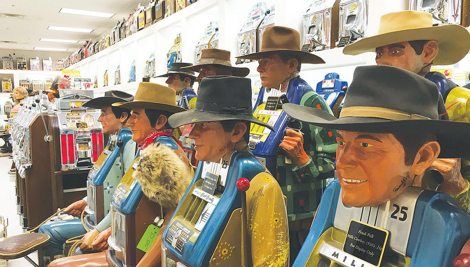 The three-reelers include slot machines carved in the 1950s by Arizona cowboy artist Frank Polk.