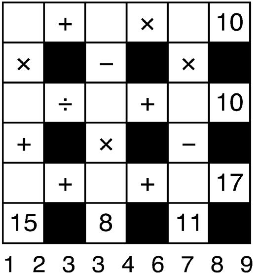 The idea of Go Figure is to arrive at the figures given at the bottom and right-hand columns of the diagram by following the arithmetic signs in the order they are given (that is, from left to right and top to bottom). Use only the numbers below the diagram to complete its blank squares and use each of the nine numbers only once.