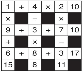 The idea of Go Figure is to arrive at the figures given at the bottom and right-hand columns of the diagram by following the arithmetic signs in the order they are given (that is, from left to right and top to bottom). Use only the numbers below the diagram to complete its blank squares and use each of the nine numbers only once.