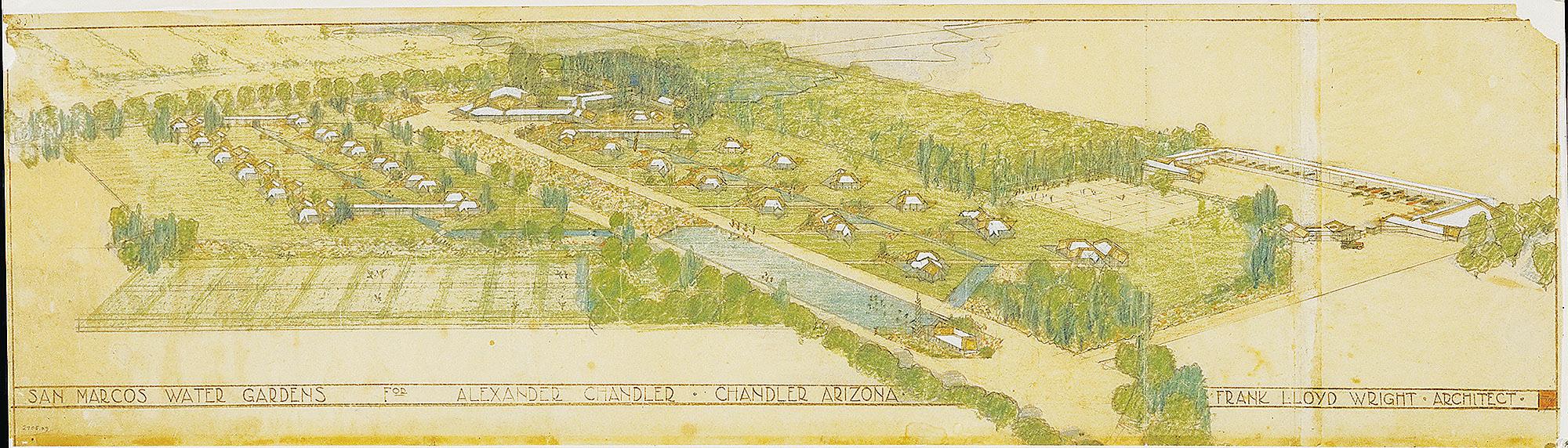 Hearing that Wright was in town, A.J. Chandler invited him over to the San Marcos hotel. By this time, Chandler had amassed 18,000 acres of land and had transformed most of it into a verdant oasis, crisscrossed by an orderly network of canals. The San Marcos was a winter playground for the rich and famous. Chandler wanted his crown jewel to
