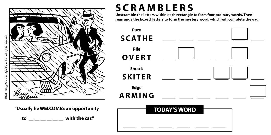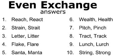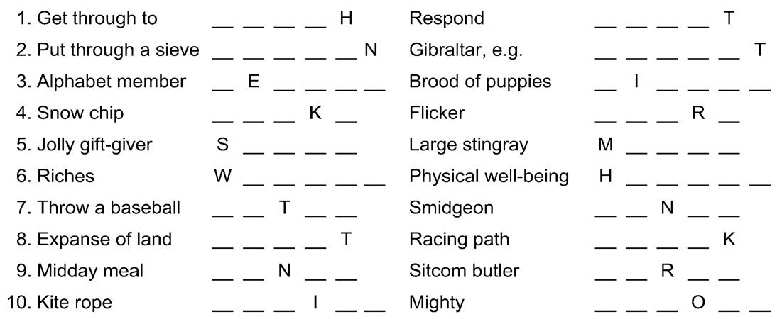 Each numbered row contains two clues and two answers. The two answers differ from each other by only one letter, which has already been inserted. For example, if you exchange the A from MASTER for an I, you get MISTER. Do not change the order of the letters.