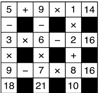 The idea of Go Figure is to arrive at the figures given at the bottom and right-hand columns of the diagram by following the arithmetic signs in the order they are given (that is, from left to right and top to bottom). Use only the numbers below the diagram to complete its blank squares and use each of the nine numbers only once.