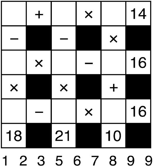 The idea of Go Figure is to arrive at the figures given at the bottom and right-hand columns of the diagram by following the arithmetic signs in the order they are given (that is, from left to right and top to bottom). Use only the numbers below the diagram to complete its blank squares and use each of the nine numbers only once.