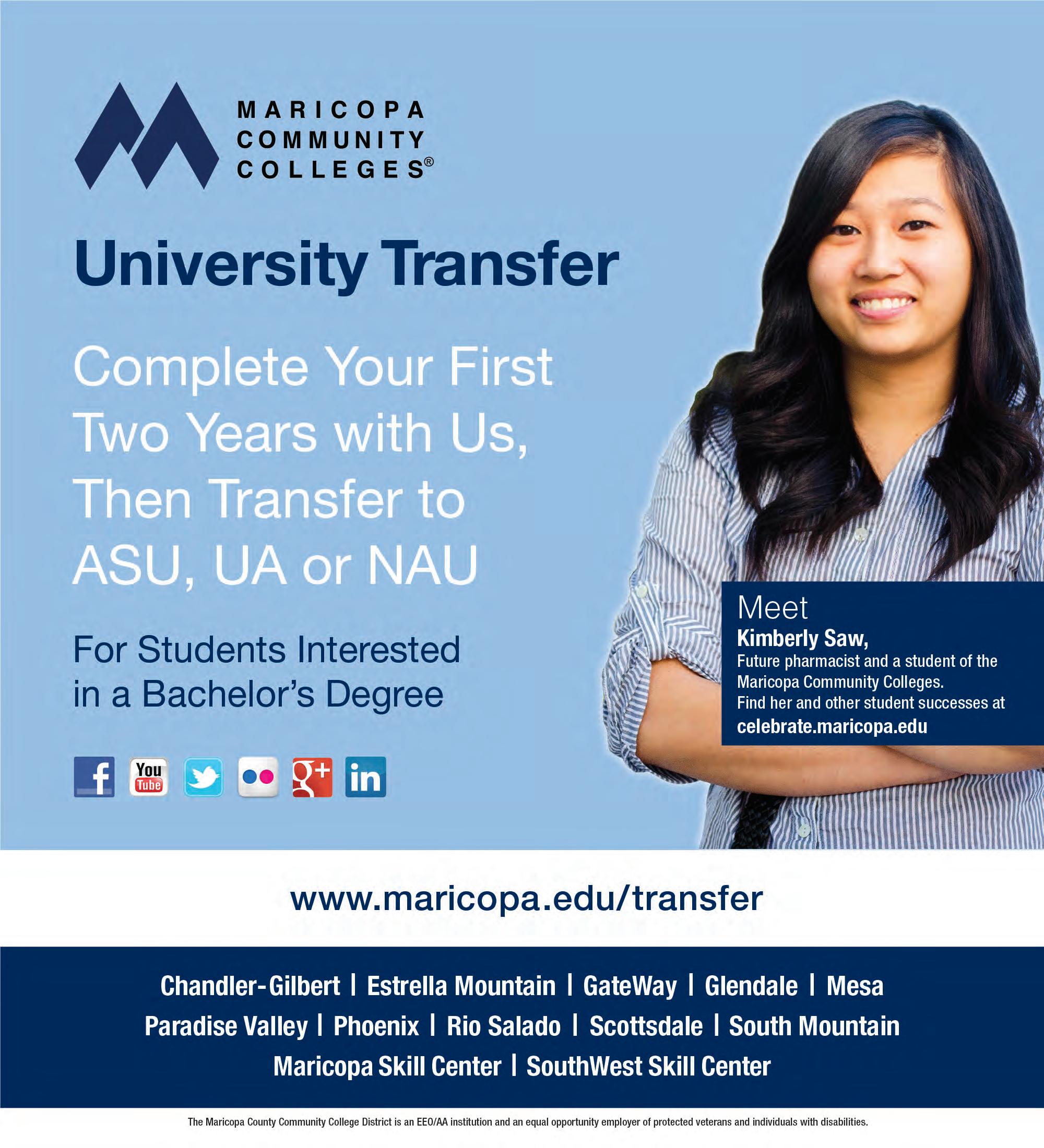 • Reach out to Maricopa’s private and out-of-state college and university advisors to explore transfer options. Some are more expensive per credit than public universities, but they often accept more credits and offer flexible scheduling. This search tool can help you narrow down what is important to you: http://www.maricopa. edu/transfer/partners/partner_list.php (Click on University Partner Search).