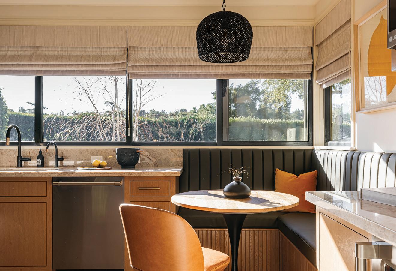 In 2022, the couple replaced the dated kitchen, creating a wide galley kitchen with dark oak cabinets, faux soapstone counters, deep copper sink, tile backsplash (with the CALCO peacocks) and cork flooring. A comfy wood and leather banquette, with table, was built in the corner.
