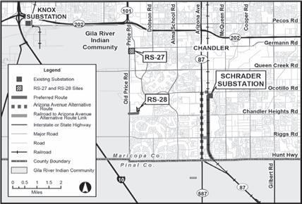 A PUBLIC HEARING WILL BE HELD before the Arizona Power Plant and Transmission Line Siting Committee (“Committee”) regarding the application of Salt River Project Agricultural Improvement and Power District (“SRP” or “Applicant”) for a Certificate of Environmental Compatibility (“CEC”) authorizing the Price Road Corridor Project, non-Gila River Indian Community portion (the “Project”). The Project will consist of approximately 3.5 miles of new 230-kilovolt (“kV”) transmission from the Schrader Substation to the Gila River Indian Community boundary that is adjacent to Hunt Highway as well as two new substations, RS-27 and RS-28, and associated transmission. All Project components are located in the City of Chandler, Arizona, or within Maricopa County.