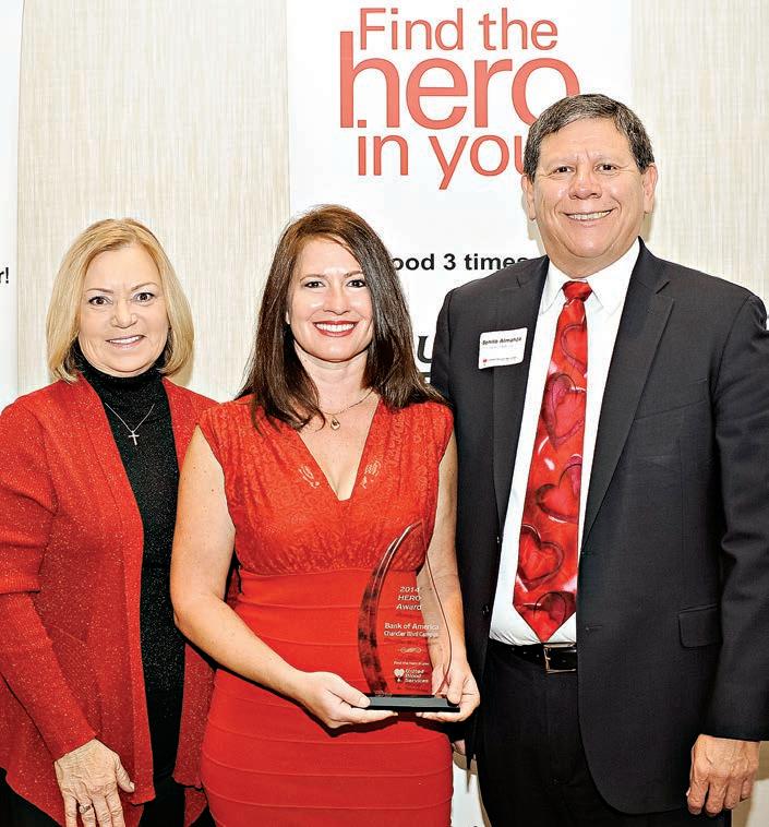 Rachael Witkin and Barbara Hover from Bank of America Chandler were among the top 3 percent of award-winning blood drives recently honored by United Blood Services for earning Hero Awards. The Chandler Bank of America was among the top 28 organizations across Arizona that qualified for the award out of 1,080 organizations. Pictured from left are United Blood Services District Director of Field Operations Audrey Jennings with blood drive coordinator Rachael Witkin and Bank of America Phoenix Market President Benito Almanza. (Coordinator Barbara Hover was unable to attend.) Submitted by United Blood Services.