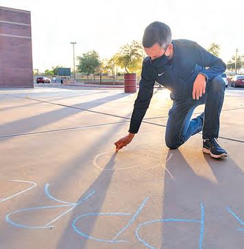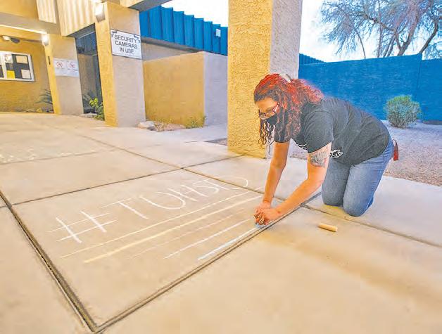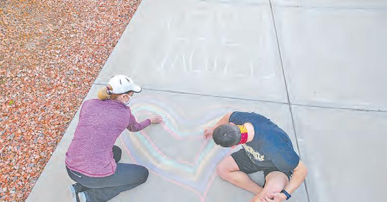Chalking up support for Tempe Union High School District teachers and other employees Sunday evening were Laura Chapnek and William Chapnek at Mountain Pointe High School. They were among a group of parents and legislators who wanted to show their support for sta as in-class learning began for the first time in nearly four months. For the story, see page 3. (Pablo Robles/AFN Sta Photographer)