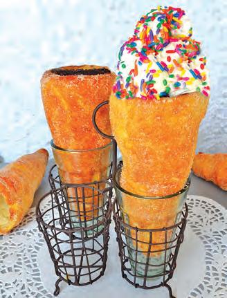 this cone is made with store-bough biscuit dough, making the process a whole lot easier. The dough is wrapped around a homemade paper mold. It is then baked, rolled in cinnamon and sugar, baked again and then coated on the inside with dipping chocolate which seals it, preventing a soggy cone. Load it up with scoops of your favorite ice cream for a cool and festive way to celebrate summer, Southwest style!.■