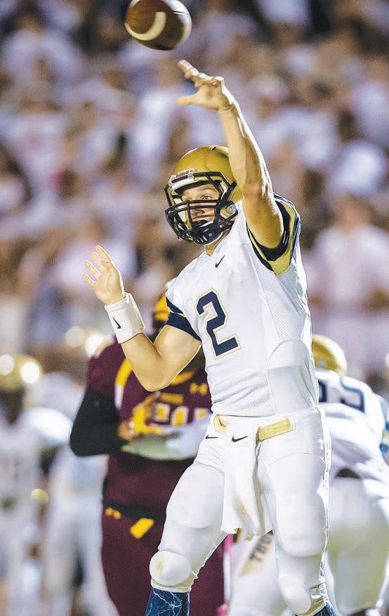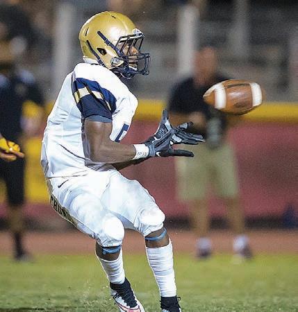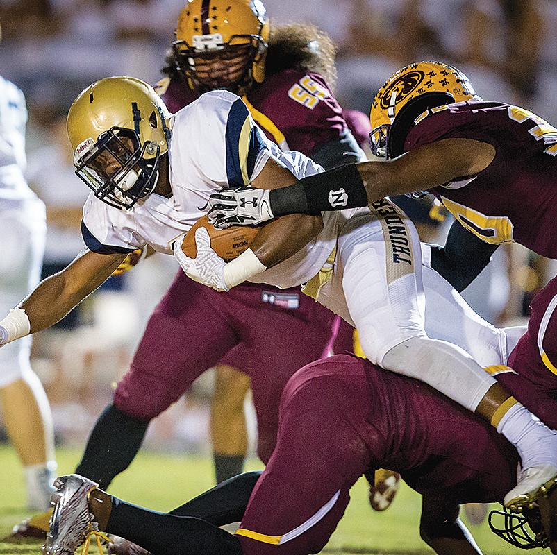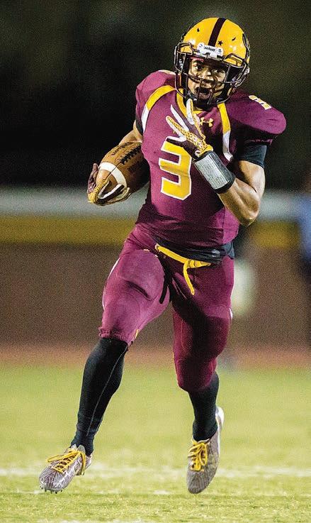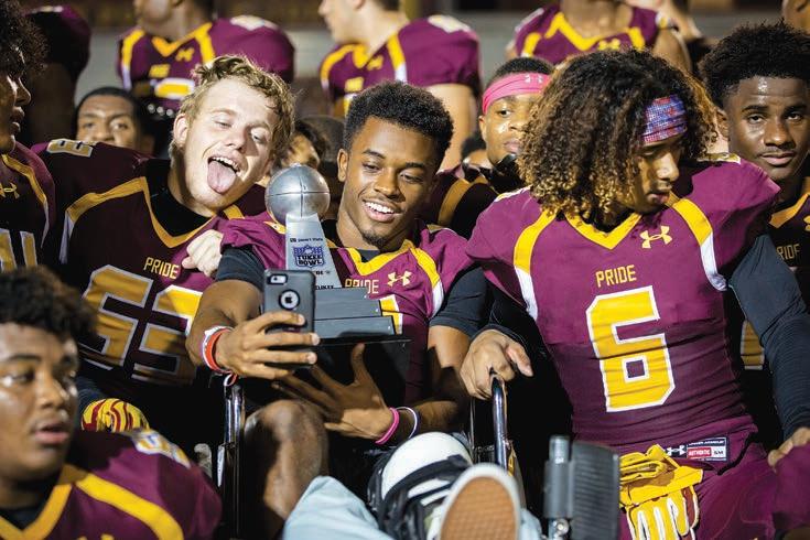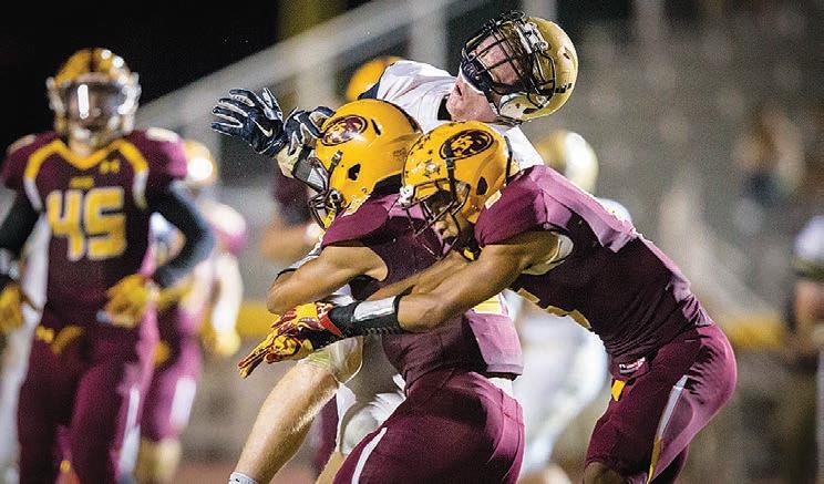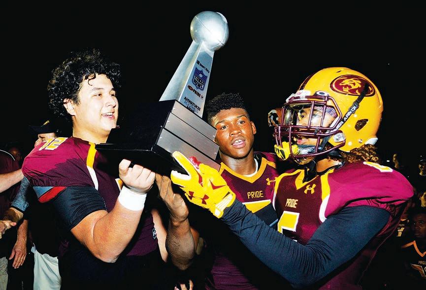 Lofting the first annual Ahwatukee Bowl Trophy from the Ahwatukee Foothills News are Mountain Point High football team captains, from left, Eddie Rivas, Rashie Hodge, Jr. and Jaydon Brooks. Mountain Pointe beat crosstown rivals Desert Vista 27 to 13 in the 20th annual bowl.
