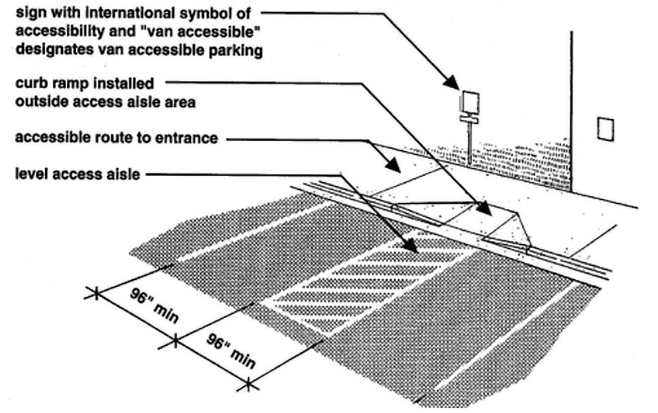 An illustration from the ADA.gov website shows some of the requirements for parking spaces under the Americans with Disabilities Act.