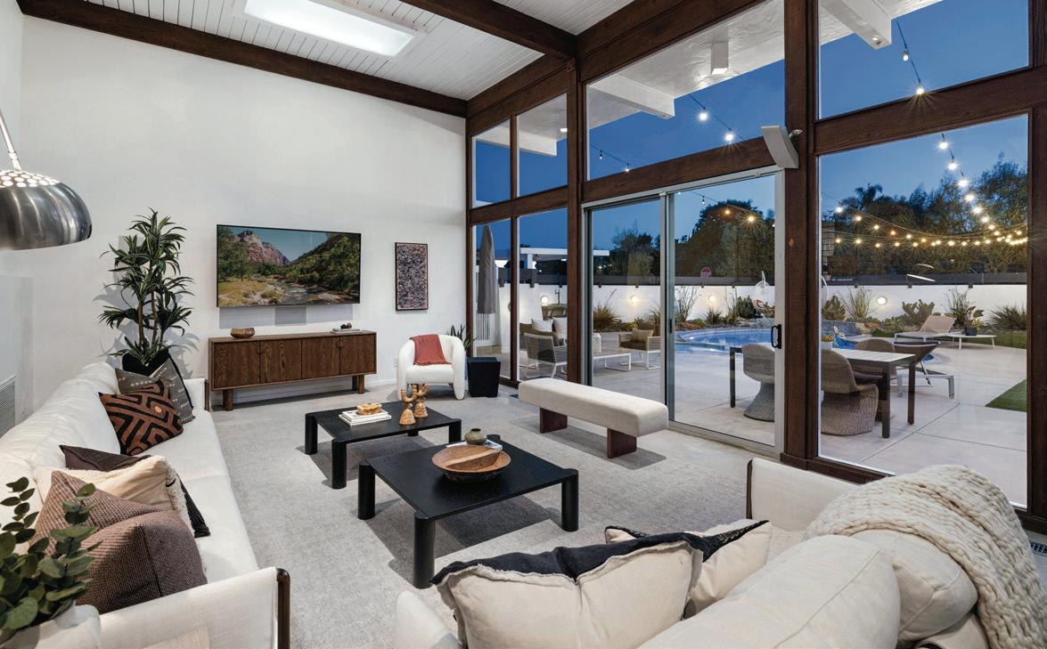 oughtfully designed, this custom modern masterpiece will check all your boxes. is 5-bedroom, 5-bathroom (with an attached multi-level ADU) Newport Heights dream home sits on a stunning double parcel with prime indoor/outdoor living and exudes high-end modern luxury. Utilizing a mix of quality natural materials and expansive walls of glass, this home is a stunning combination of contemporary design and warmth. e open-concept layout, anchored by a twostory limestone replace wall and a striking custom chandelier, shows exceptional attention to detail throughout. e heart of the home is the intelligently designed kitchen and includes an extra-large central island, gorgeous and functional Dekton countertops, custom cabinetry, high-end chef’s appliances, a walk-in pantry, and an additional complete caterer’s kitchen. Retreat to the primary suite where you will nd dual walk-in closets, a luxurious spa-like bath out tted for ultimate relaxation, and an attached large deck. Travel downstairs by way of the central oating steps, or custom elevator, and nd yourself in the secondary living space with access to the rear yard—designed to entertain with a covered loggia, a fully equipped bar, and a sparkling pool surrounded by lush landscaping.