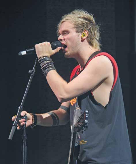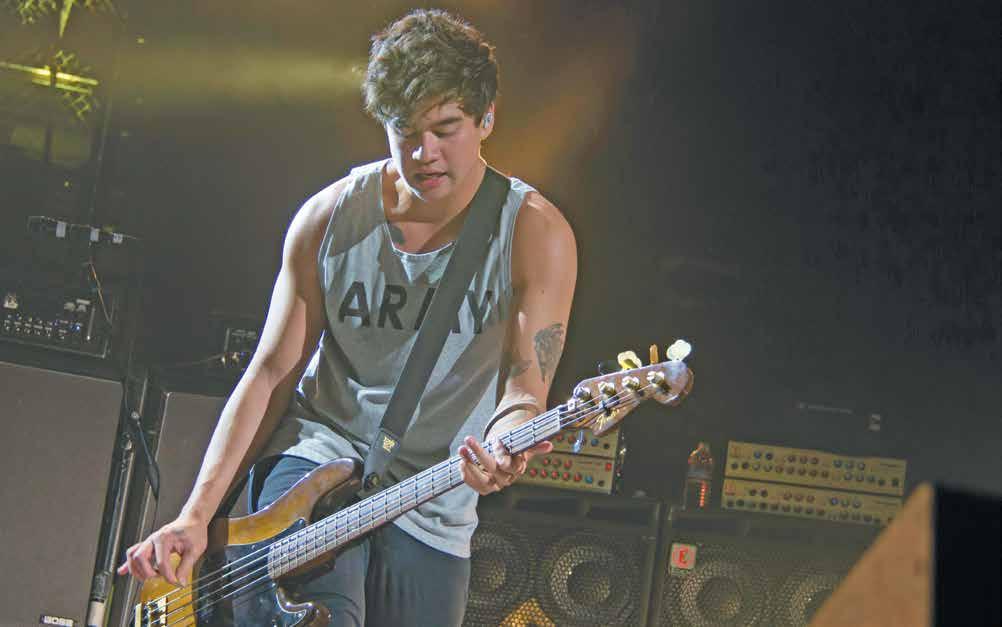 1. Guitarist Michael Clifford rocked an Ozzy Osbourne shirt and green hair at the show. 2. Luke Hemmings grabbed the mike for the “Sounds Live Feels Live World Tour.” 3. Bassist Calum Hood co-wrote many of 5SOS’s songs, including “Jet Black Heart.”