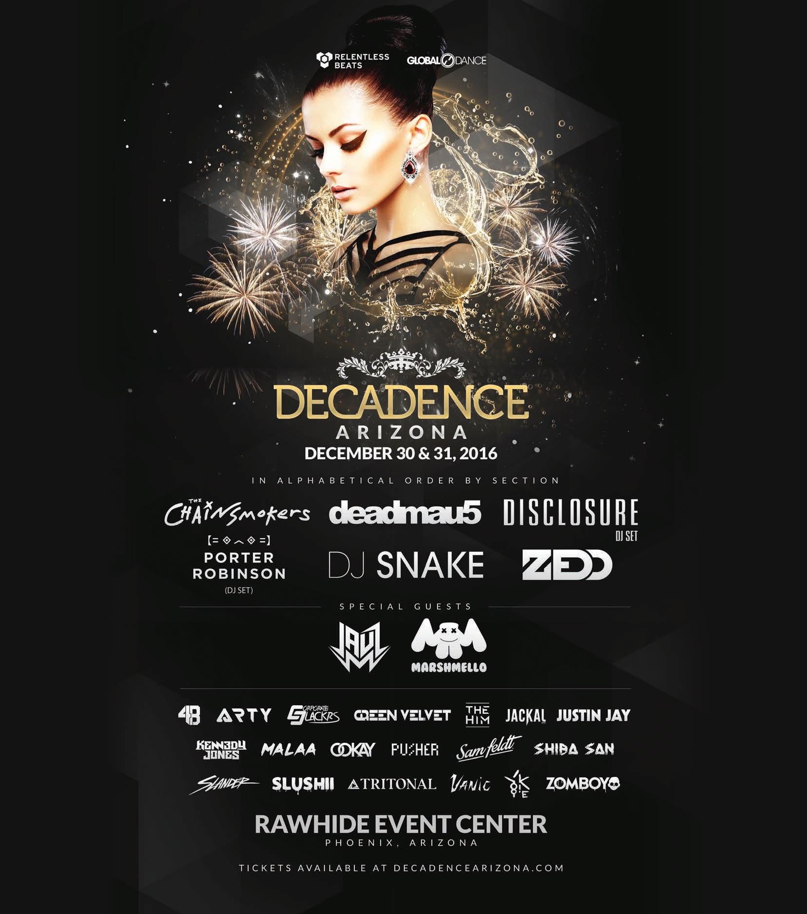 This year’s biggest act, The Chainsmokers, is slipping under the radar to spend New Year’s Eve with its fans in Chandler. That sexy video for their hit “Closer” has raised eyebrows, but it’s nothing compared to the steam The Chainsmokers will generate during its set at Decadence. Decadence begins on December 30, but on New Year’s Eve, The Chainsmokers will be joined by the likes of DJ Snake and Zedd.
