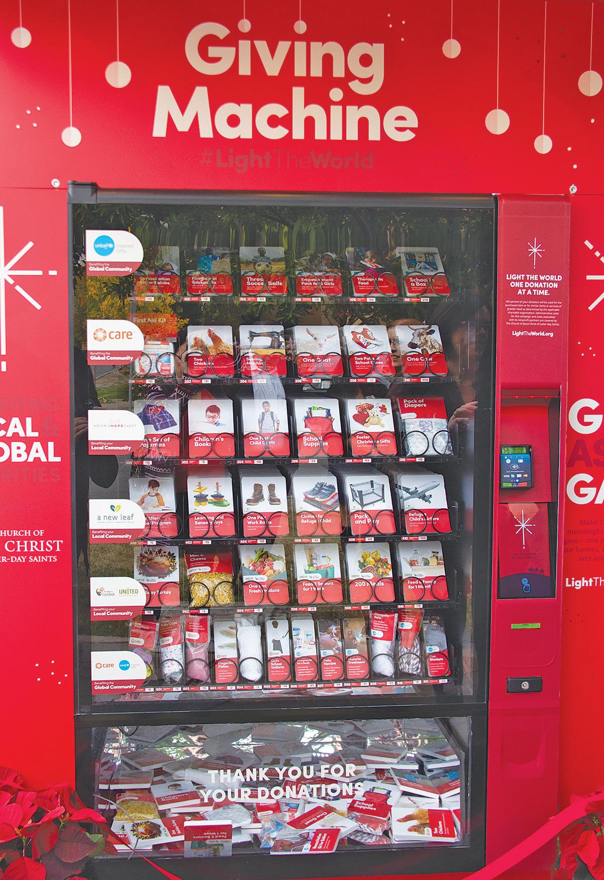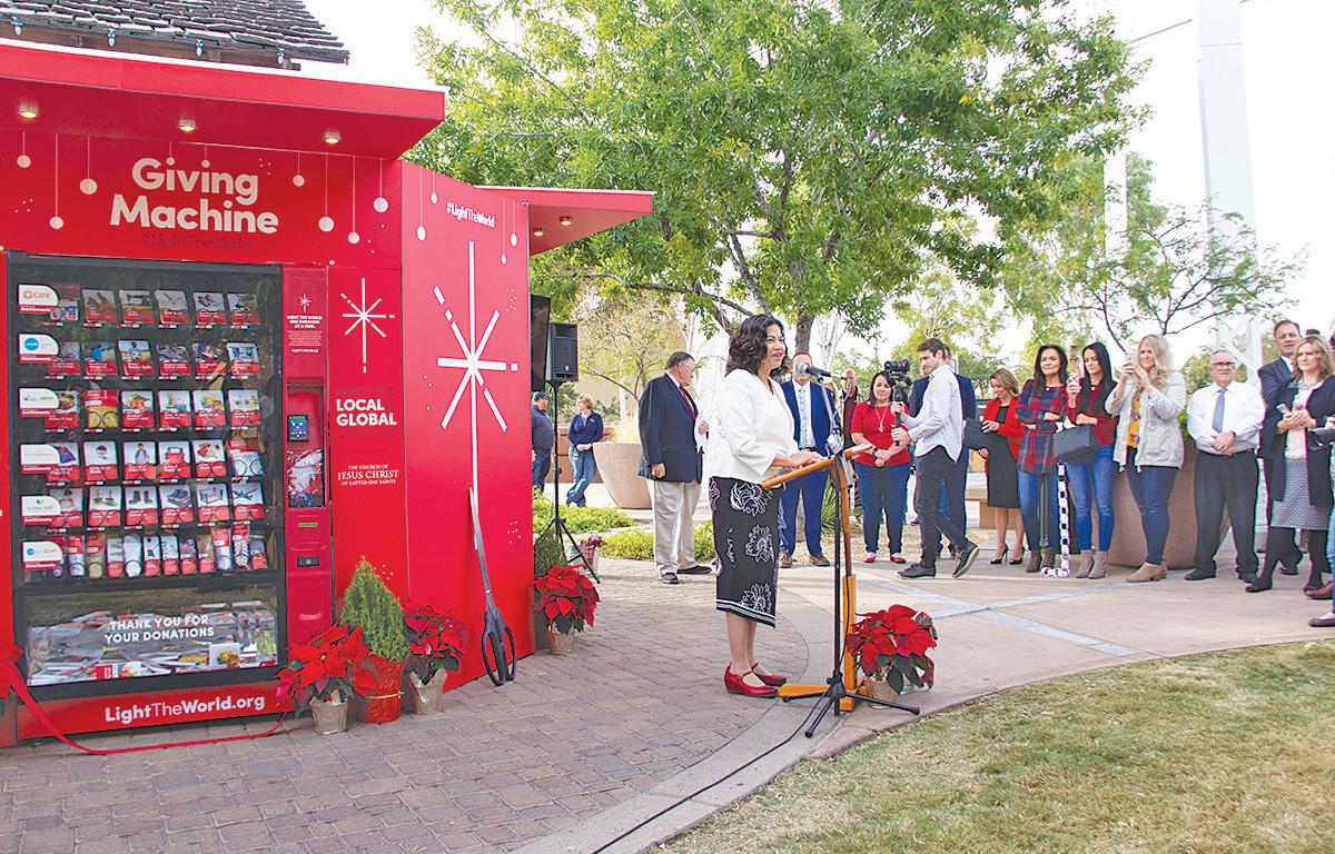 Payne was the first person to use one of two “Giving Machines” unveiled last Thursday by the Church of Jesus Christ of Latter-day Saints at Water Town Plaza. Gilbert is one of only five locations in the world that will have the machines now through Dec. 31. The others are in New York, Salt Lake City, London and Manila.