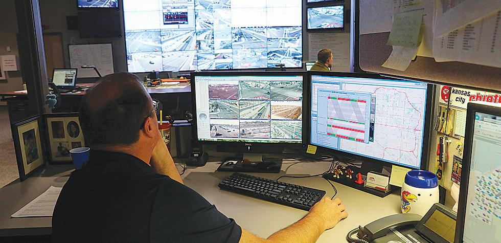 Engineers sit in the Mesa Traffic Management Center, staring at the Video Wall, using a series of sensors and cameras to track traffic flow and to change the timing of lights.