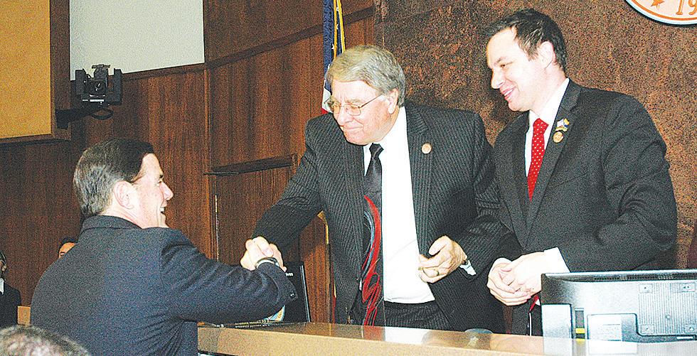 Senate President Steve Yarbrough and House Speaker J.D. Mesnard, both from Chandler, greet Gov.