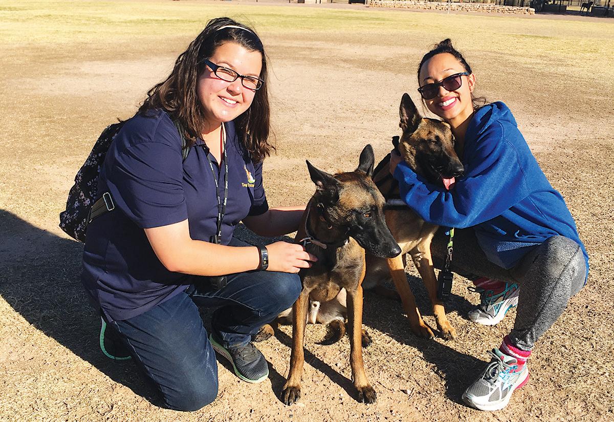 Chandler residents Anysia Jaramillo (left) and Tori Brennan pose with their Belgian Malinois, Voodoo and Karma, at the Paseo Vista Recreation Area on McQueen Road. Jaramillo said she’s interested in receiving more information about the Dog Walker Watch Program.