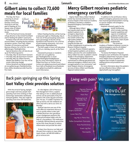 Gilbert Feeding Families will be hosting a restaurant night on Wednesday, May 6. Visit one of the participating restaurants and a percentage of the bill will be donated to the food drive. For a full list of participating restaurants, visit www. gilbertaz.gov/feedingfamilies. The final weigh-in event will take place at 7:30 a.m. Monday, June 8, at the Town Hall. Interested businesses or residents should visit www.gilbertaz. gov/feedingfamilies or email gilbertfeedingfamilies@gilbertaz. gov for more information. Follow @ GilbertYourTown on Twitter (www. twitter.com/gilbertyourtown) and Gilbert Town Hall on Facebook (www.facebook. com/gilberttownhall) for additional event information.