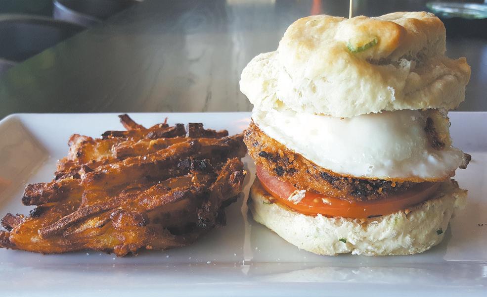 scallion biscuits, then crispy duck sausage, tomato, sunny eggs and a splash of mild house Sriracha sauce to brighten the dish. The egg yolk cascaded down the sandwich like a creamy yellow sauce and the white yam hash browns were browned and crispy.