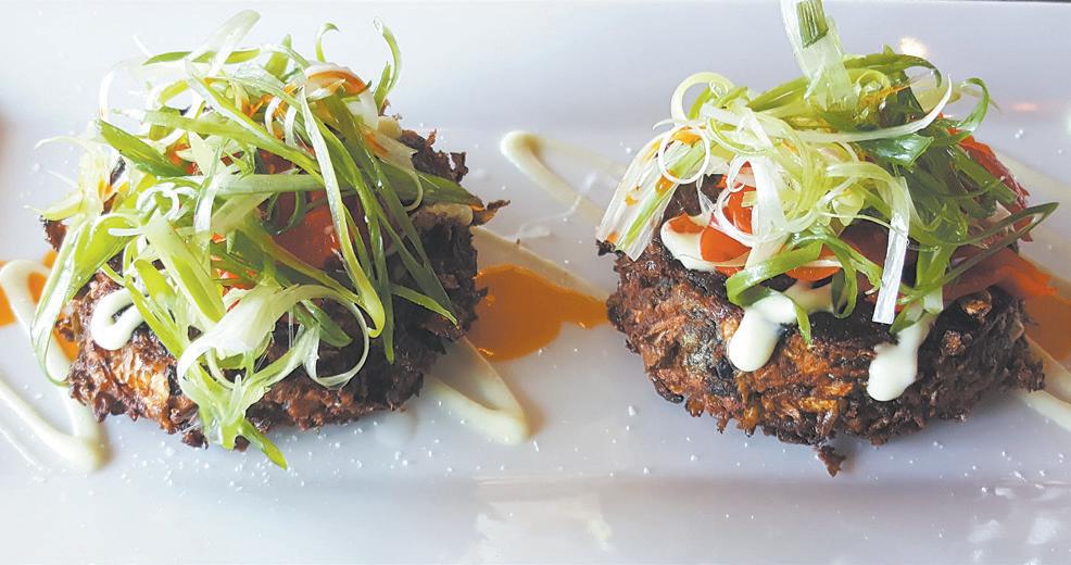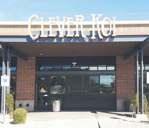 An almost monochromatic color scheme, with soothing shades of black, brown, gray and white, is accented with touches of gold in the hanging basket lights and small glassware. Eclectic art pieces hang on faux tusks on a wall near the kitchen and large glass windows open onto a 40-seat outdoor dining patio. Clever Koi recently rolled out a brunch menu available from 11 a.m. to 2 p.m.