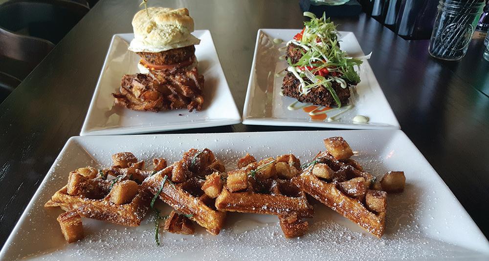 The last of the brunch trio was the Kimchi Belgian Waffle. This is not in-yourface kimchi, since just a hint of housemade savory kimchi liquid is added to the batter. Boltz informed us that it is “three-day kimchi, so there is not quite so much funkiness.” The crispy waffle was topped with cubes of fried pork belly and coconut water syrup, which adds a light touch of sweetness to the flavor profile.