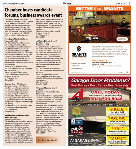 media expert, he has been featured in several publications including Success, Mashable, Search Engine Land and CIO. Admission is $25 per session for members; $40 per session for nonmembers. 9:30 a.m. to 11 a.m., Friday, June 10 St. Xavier University 92 W. Vaughn Ave. Gilbert 85233 Legislative Districts 12 and 17 Candidate Forum Presented by SRP The Gilbert Chamber of Commerce will host a series of candidate forums and invites residents to learn about the candidates. This forum features candidates running for legislative districts 12 and 17. The candidates’ responses at these forums, along with a written candidate questionnaire and an individual interview, will be used to determine the Chamber’s endorsements. 10:45 a.m. to 1 p.m., Monday, June 13 10:45 a.m. - registration, visit campaigns and lunch 11 a.m. - candidate forum begins 1 p.m. - candidate forum concludes Chandler-Gilbert Community College, Agave Room 2626 E. Pecos Rd. Chandler 85225 10th Annual Business Awards Luncheon Presented by American Furniture Warehouse This annual celebration highlights the Chamber’s Year-In-Review, honors the Chamber’s volunteers and announces the recipients of this year’s Annual Business Awards. Admission is $35 for members; $50 for non-members; and add $10 a person when registering after 11 a.m. Thursday, June 9. Sponsored table for eight is $350; which includes reserved seating for eight, a sponsor’s name on an event program, a logo on reserved table signage and priority placement within the area of other sponsored tables. 11 a.m. to 1 p.m., Wednesday, June 15 Doubletree by Hilton Phoenix-Gilbert SanTan Elegante Resort & Conference Center 1800 S. SanTan Village Pkwy. Gilbert 85295