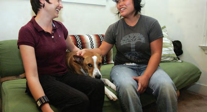 Roommates Tricia Renkan, left, and Rose Foronda hang out with their dog, Hiro Nakamura, at home in Oakland, California.