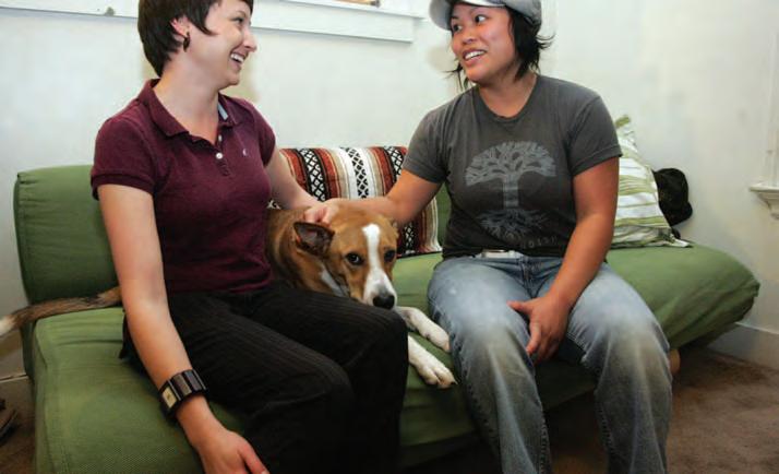 Roommates Tricia Renkan, left, and Rose Foronda hang out with their dog, Hiro Nakamura, at home in Oakland, California.