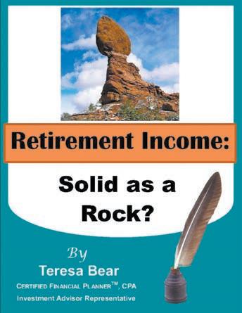 Teresa Bear, CFP, CPA (www.TeresaBear. com) specializes in retirement planning and asset preservation for retirees and those about to retire. Send questions to Teresa@ TeresaBear.com or call (480) 503-0050. Investment advisory services provided by Brookstone Capital Management LLC., a SEC-registered investment adviser. Brookstone Capital Management and Teresa Bear LLC are independent of one another. Neither the author nor the publisher is engaged in providing accounting, legal, investment or other professional services through the publication of this article—you must seek competent, professional representation for your personal situation. This is for informational purposes only and is not a solicitation or recommendation of any investment strategy. Investments and/ or investment strategies involve risk including the possible loss of principal. There is no assurance that any investment strategy will achieve its objectives.