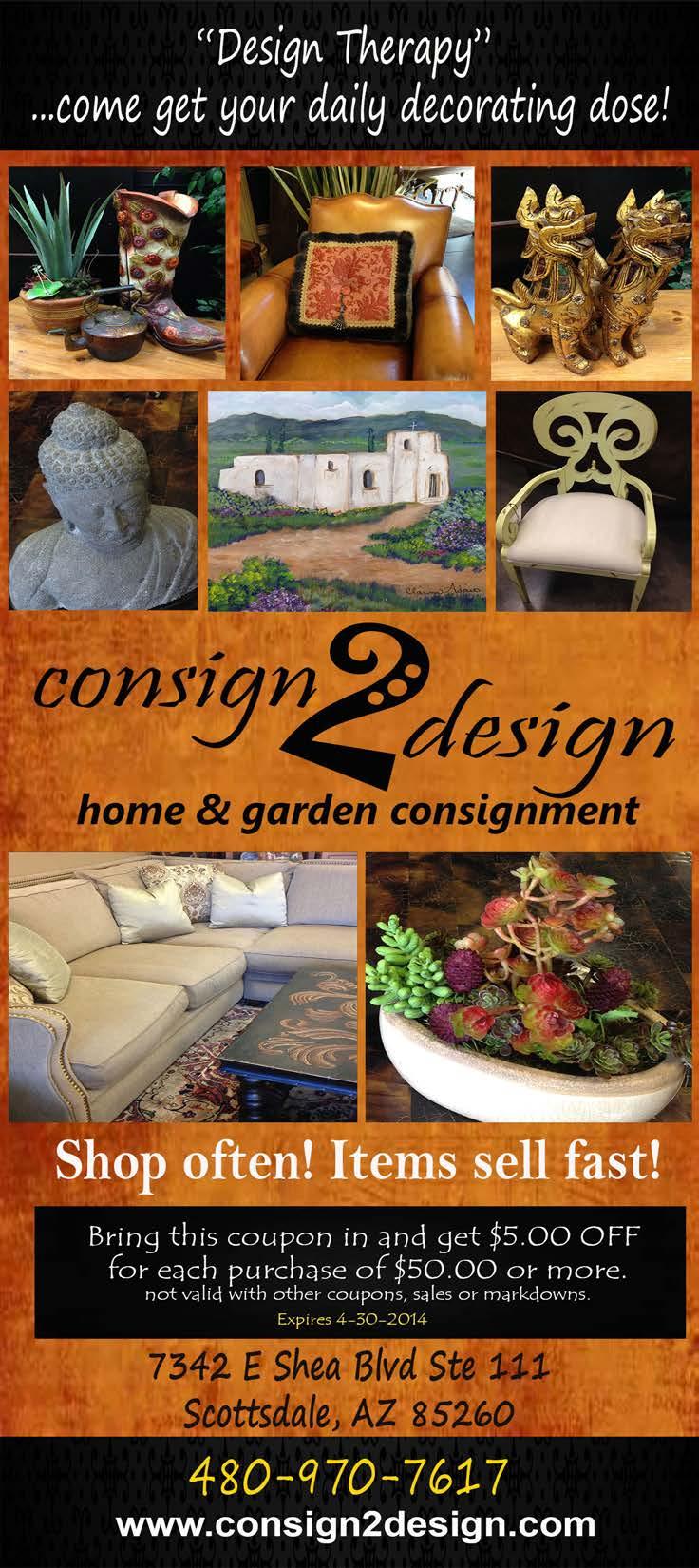 Consign2Design is located at 7342 E. Shea Blvd. (northeast corner at Scottsdale Road). Call (480) 9707617 or visit www.consign2design. com.