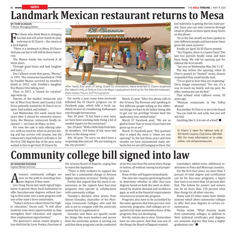 or those who think Mesa is changing too fast and will never match its past, welcome to El Charro â the return of a local legend. âThere is a landmark in Mesa, El Charro And you can bet it will still be there tomorrow. The Munoz family has nurtured it all these years. Through good times and bad, laughter and tearsâŚ.â Doc Calhoun wrote that poem, âMunoz,â in 1991. The restaurant launched in 1958 by Freddie Munoz survived its founderâs death in 2012, with Freddieâs daughter Eva Munoz Orta taking over. Then, in 2017, a âclosed for vacationâ sign went up. Patrons of the modest restaurant and bar at West First Street and Country Club Drive patiently waited for El Charro to reopen. And waited, and waited ... Last Wednesday, this week, nearly four years after it closed for extensive renovations, the Mexican restaurant ďż˝inally reopened â on Cinco de Mayo, no less. For now, the cafe is only offering takeout, with no word on when in-person dining and bar service will resume, but the restaurantâs loyal followers will take it. On the ďż˝irst 100 degree day of the year, many waited in line to get their El Charro ďż˝ix.