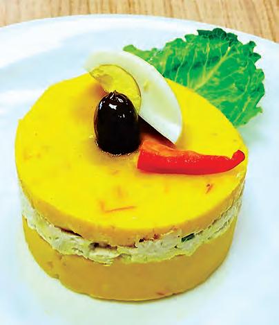 Causa limena is a soft spicy mashed potato tower sandwiching seasoned shredded chicken. (Taste of Peru).