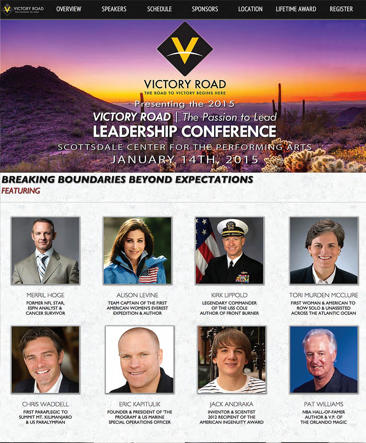 Speakers at the event include Merril Hoge, former NFL star and ESPN analyst; Alison Levine, team captain of the first American Women’s Everest Expedition; Kirk Lippold, commander of the USS Cole; Tori Murden McClure, the first woman to row solo across the Atlantic Ocean; Chris Waddell, the first paraplegic to reach the summit of Mount Kilimanjaro; Eric Kapitulik, founder of “The Program” and U.S. Marine special operations officer; Jack Andraka, an inventor and scientist and the youngest nominee for the Nobel Prize; and Pat Williams, an NBA Hall of Famer and vice president of the Orlando Magic.