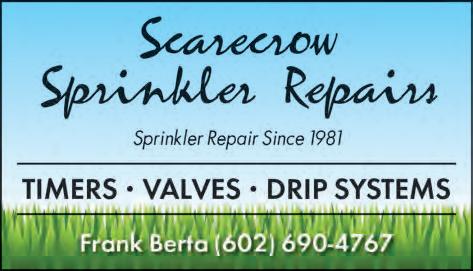 SCARECROW SPRINKLER REPAIR Sprinkler repairs since 1981 Timers, Valves, Drip Systems Frank Berta 602-690-4767 See Our Ad in the Biz