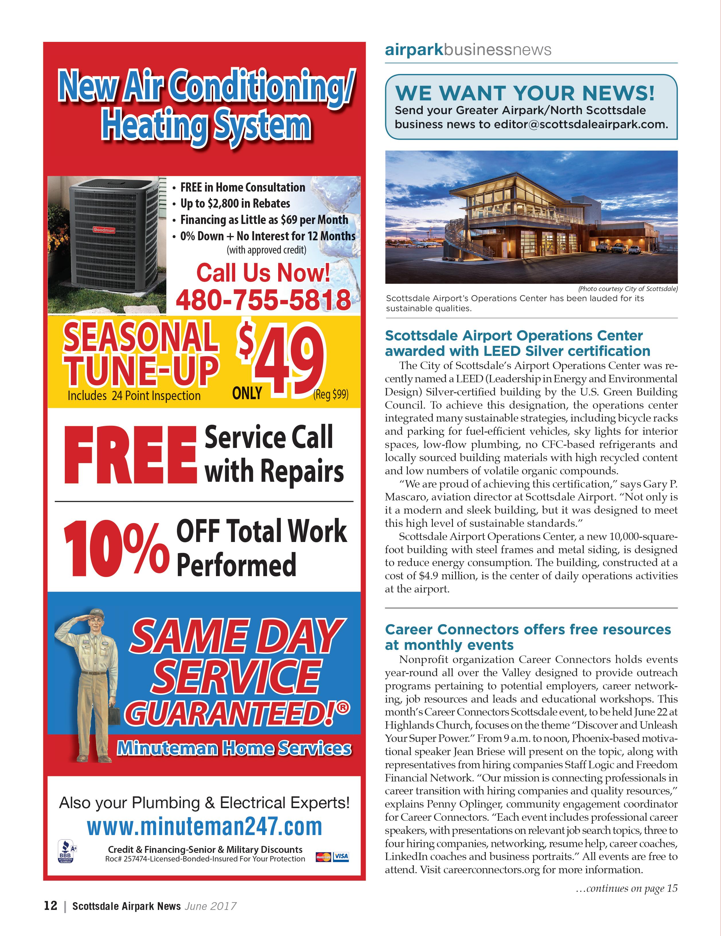 Meyer’s been in the Airpark for more than 32 years, working in corporate aviation positions ranging from fixed-base operator (FBO) at Scottsdale Airport to general manager of Turbofan Aircraft Programs with Honeywell. As principal and founder of Airport Property Specialists, Meyer develops airplane properties and commercial real estate in the Airpark, including hangar space. And right now, hangar space is tight – Meyer says his company only has about 2 percent of available hangar space, a result of the recent economic upturn that’s led to a slew of new construction projects around the Airpark. In this month’s cover story, “Hangars On!” (page 23), writer Kenneth LaFave explores the current state and future of aviation storage with Meyer and other sources. Turns out, the hangar shortage isn’t limited to Scottsdale.
