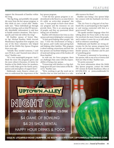 F E AT U R E support the thousands of families within the wing. “The big thing, and probably why people shy away from the key spouse program, is they think it’s just a social club,” Maldonado says. “These individuals go through specific training, such as what PII (personally identifiable information) is and how to handle sensitive situations. They have a specific and vital role within the wing.” Jill Kuehler, spouse of Senior Master Sgt. Michael Kuehler, 944th Aircraft Maintenance Squadron first sergeant, was one of the three volunteers who helped kick off the 944th’s Key Spouse Program three years ago. “Initially they needed someone, I said sure I’ll do it, and I learned more about it since,” Kuehler says. “It’s a very meaningful program. And I think the more (the program) grows and the more robust it becomes, it’s better for families of the 944th, better for members, and it really helps grow the family participation and atmosphere of support here.” Maldonado wants Reserve citizen airmen to understand the importance of the