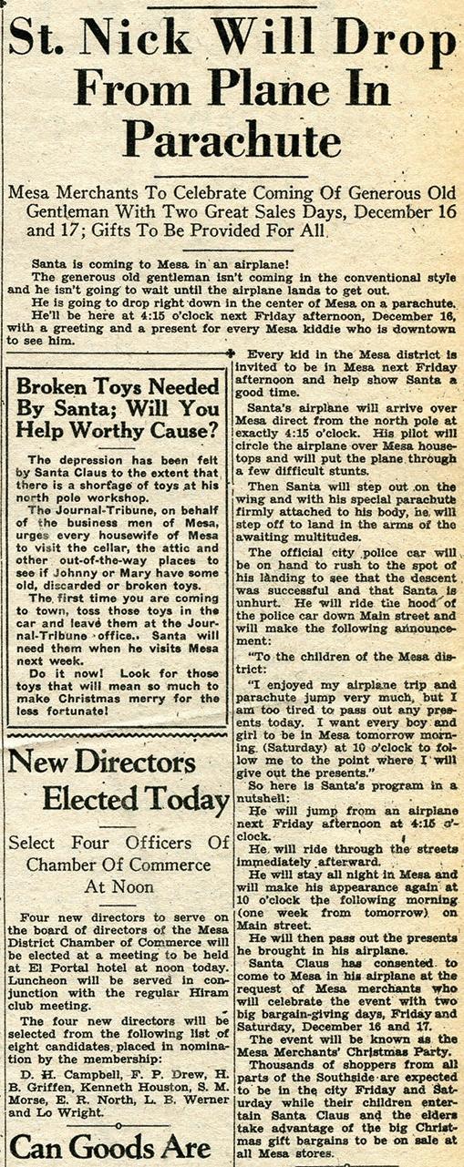 Young Tribune editor John McPhee dreamed up the parachuting Santa stunt, and it was a brilliant example of civic boosterism and Depression-era marketing. Mesa merchants were licking their chops at the thought of thousands of children interacting with Santa and their parents merrily buying Christmas gifts.
